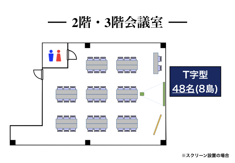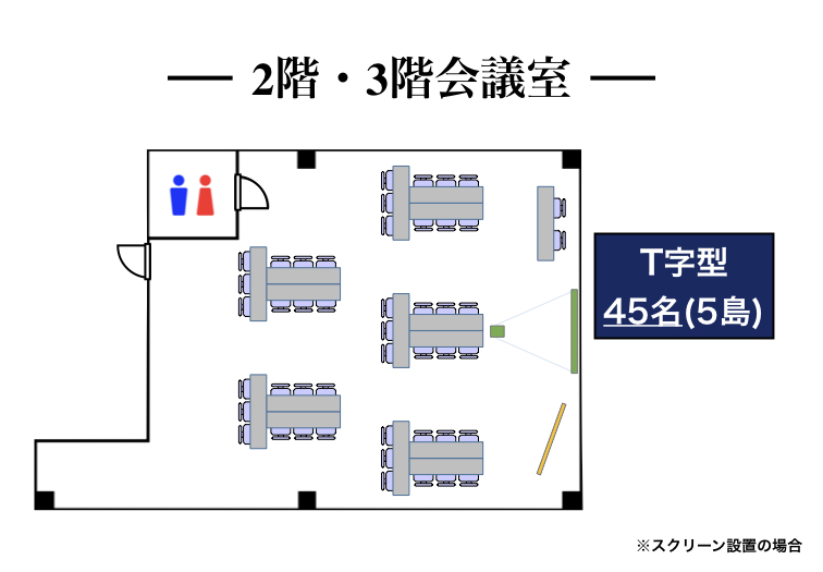 | 3階会議室 | 87.8㎡ | 76名 | 36名 | 30名 | 45名 (5島) |