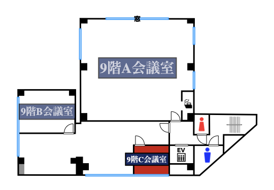 | 9階C会議室 | 15㎡ | - | - | - | - | - | - | 6名 | ¥1,000/1h ¥8,100/9h |
