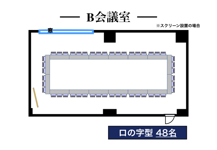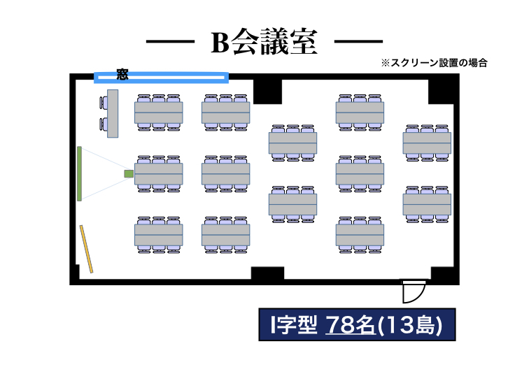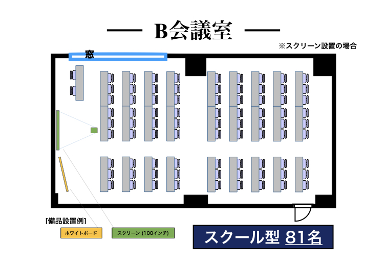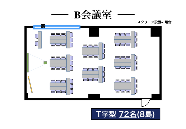 | 3階B会議室 | 96㎡ | 81名 | 48名 | 42名 | 72名 (8島) |
