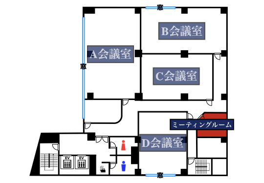 | 3階ミーティングルーム | 25㎡ | - | - | - | - | - | - | 8名 | ¥4,000/1h ¥32,400/9h |