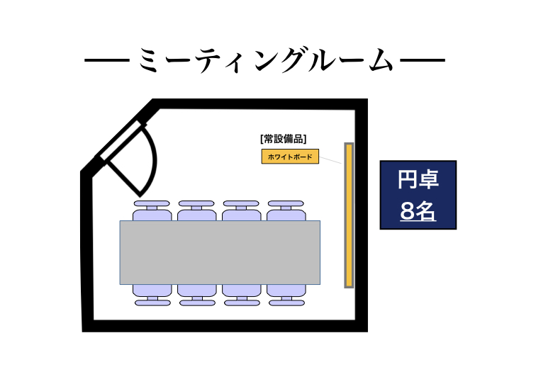| ミーティングルーム | 25㎡ | - | - | - | - | - | - | 8名 | ¥4,000/1h ¥32,400/9h |
