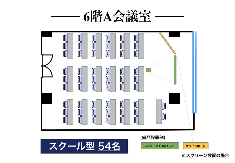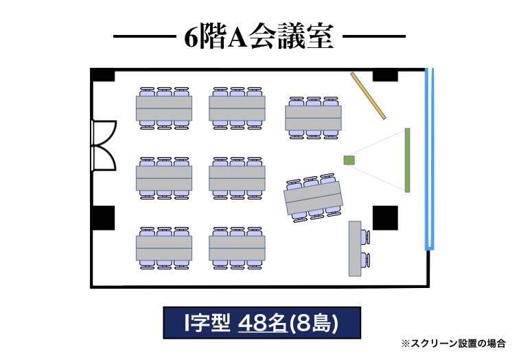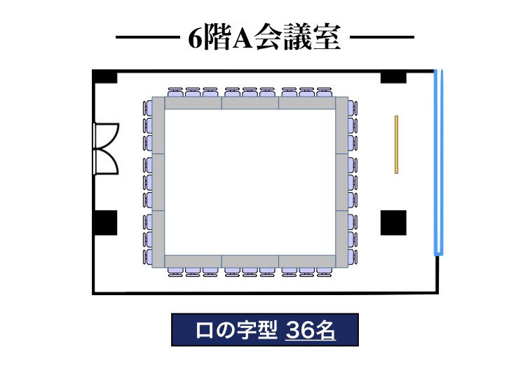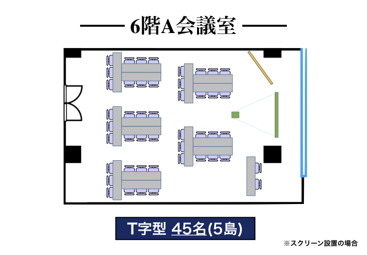 | 6階A会議室 | 77㎡ | 54名 | 36名 | 30名 | 45名 (5島) |