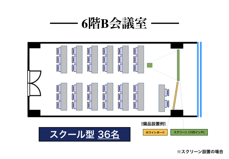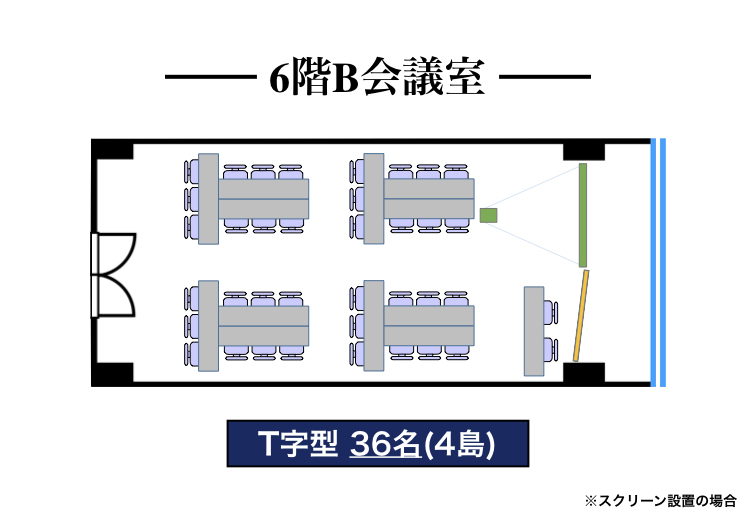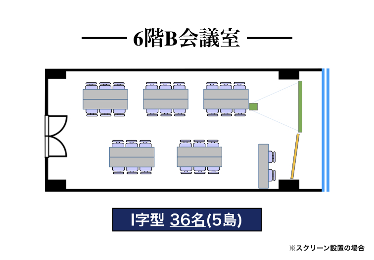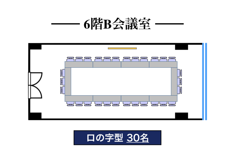 | 6階B会議室 | 55㎡ | 36名 | 30名 | 27名 | 36名 (4島) |