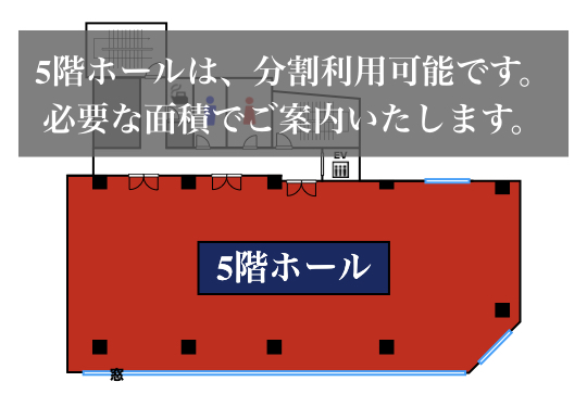 | 5階ホール | 212㎡ | 162名 | 66名 | 57名 | 108名 (12島) |