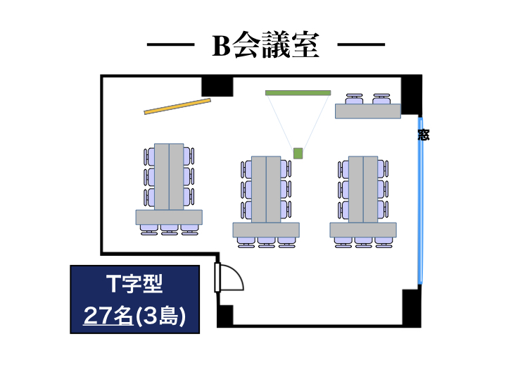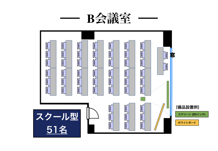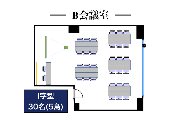 | スクール型 | 口の字型 | コの字型 | T字島型 | I字島型 | シアター型 | 円卓 (MTG only) |