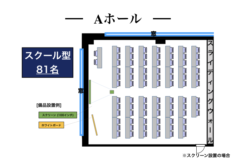 スクール形式で81名様までご利用頂ける100㎡のお部屋になります。