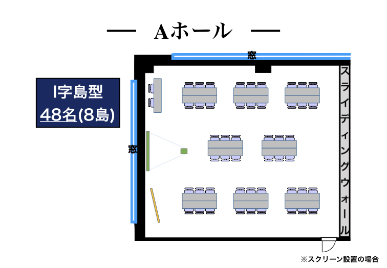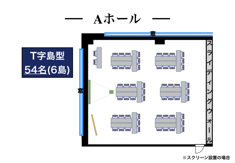 | Aホール | 100㎡ | 81名 | 42名 | 33名 | 54名 (6島) |