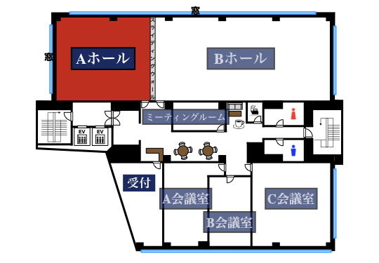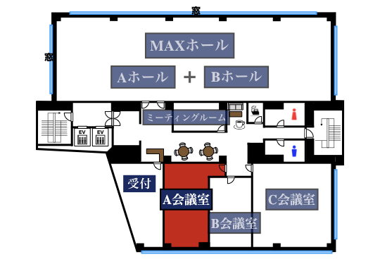 | A会議室 | 45㎡ | 36名 | 24名 | 21名 | 27名 (3島) |