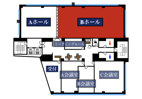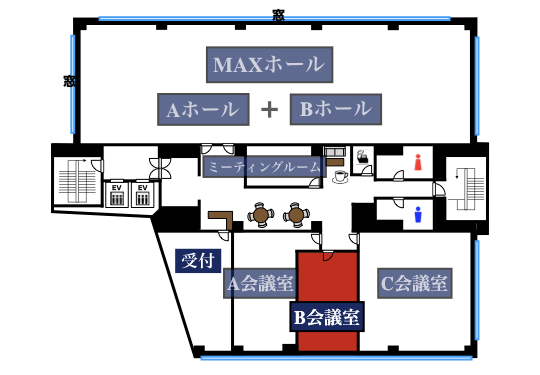 | B会議室 | 35㎡ | 30名 | 18名 | 15名 | 18名 (2島) |