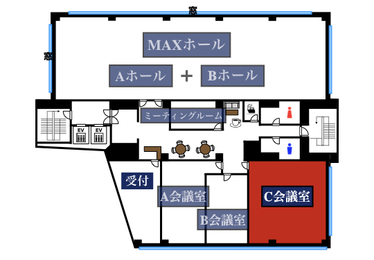 | C会議室 | 77㎡ | 66名 | 36名 | 27名 | 54名 (6島) |